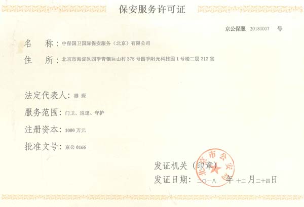 中保國衛(wèi)國際保安服務(wù)(北京)有限公司,屬中保國衛(wèi)集團(tuán)旗下子公司。能全方位的為大型客戶提供優(yōu)質(zhì)的安保、押運(yùn)服務(wù),是集人防和技防于一體的新型正規(guī)化綜合安保押運(yùn)服務(wù)企業(yè),提供人防、物防、技防、聯(lián)網(wǎng)報(bào)*、非武裝押運(yùn)等安防相關(guān)的一站式服務(wù)。 公司在國內(nèi)多省設(shè)立有分公司及分支機(jī)構(gòu),著重提升安全押運(yùn)、智能技術(shù)押運(yùn)及安全技術(shù)防范相關(guān)的服務(wù),業(yè)務(wù)范圍覆蓋全國一、二線城市、港澳地區(qū)以及海外地區(qū)。安保方面主要為政府機(jī)構(gòu)、金融機(jī)構(gòu)、企事業(yè)單位、醫(yī)療衛(wèi)生、高等院校、工業(yè)園區(qū)、大型商場、高檔住宅、智能商務(wù)樓、大型活動提供門衛(wèi)、守護(hù)、巡邏、押運(yùn)(非武裝)、安全檢查、保安特勤、私人護(hù)衛(wèi)、消防中控、安全技術(shù)防范、遠(yuǎn)洋護(hù)航等全方位服務(wù),同時(shí)面向國際市場,為中資企業(yè)在“一帶一路”沿線國家投資提供境外安保服務(wù)。 >> 更多內(nèi)容 |